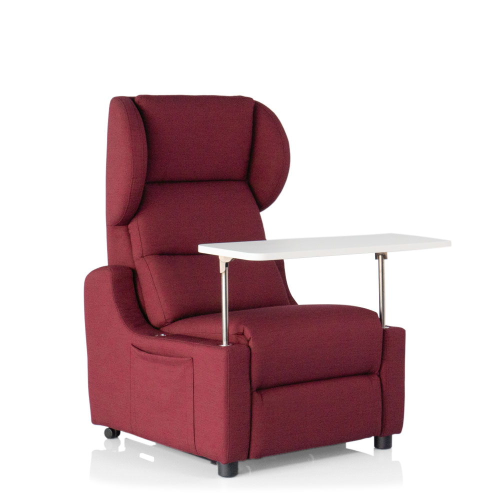 - Tavolino: una volta rimossi i braccioli può essere alloggiato un apposito e comodo tavolino che consente di mangiare, lavorare o fare attività stando seduti sulla poltrona. Il pratico tavolino è regolabile in profondità grazie a delle comode calamite che consentono di avvicinarlo alla persona nel modo più corretto.